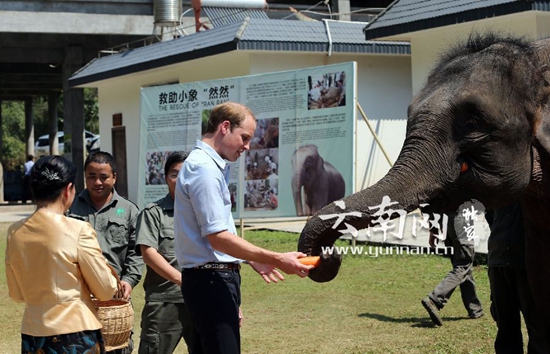 亚洲象种源繁殖基地,威廉王子给小象“然然”喂食胡萝卜。记者禹江宁/摄