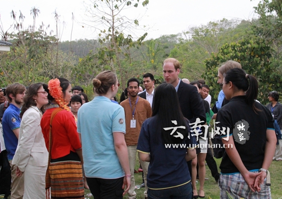 之后,在会场外的草坪上,威廉王子与来自中国、美国、印度、巴基斯坦、英国等国家的几个青年学生进行了近距离交流,这些学生大都是在西双版纳进行环境保护研究的。简短的交流现场气氛融洽,笑声不断。