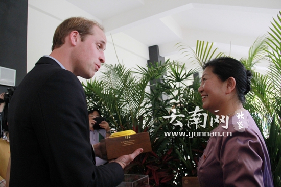 结束演讲后,云南省人大常委会副主任向威廉王子赠送了云南当地的茶叶作为礼物。