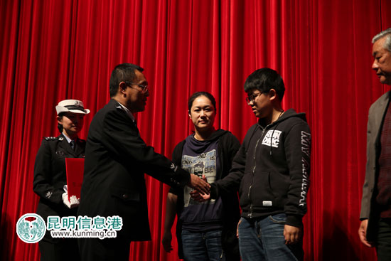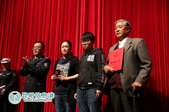 昆明市副市长、市公安局局长赵立功向刘军的亲属颁发奖章及证书。记者合宇聪/摄