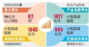 突破瓶颈制约,着重安排基础设施项目。按照加强基础设施建设,破解发展瓶颈的要求,着重安排一批基础设施项目,计划完成投资1045亿元。