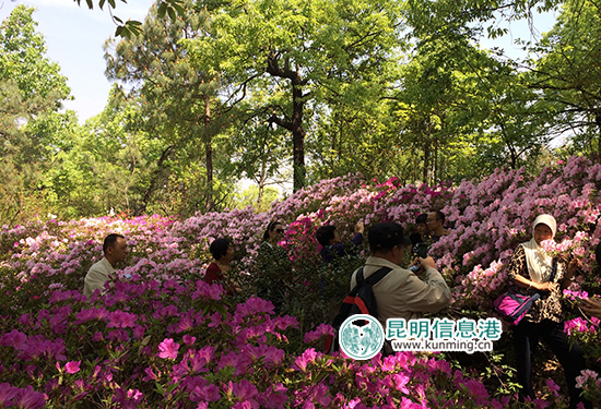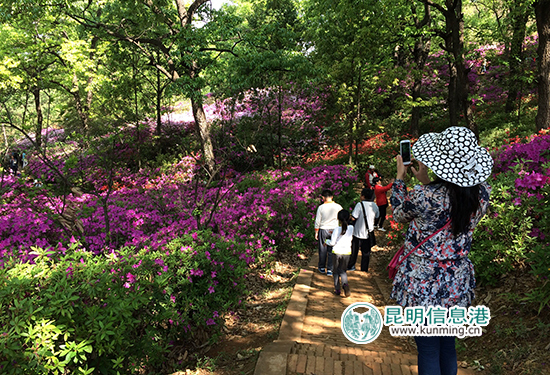 在表达了自己对家乡的美好祝愿后,游客们还畅游了杜鹃花海。黑龙潭公园里的杜鹃花谷、杜鹃花山是一片色彩绚丽的花海,映山红、双套大银红、白蝴蝶、紫孔雀、锦绣杜鹃等品种杜鹃花已是繁花似锦、争奇斗艳之盛景。不少游客纷纷拿起手机、自拍杆、单反等工具记录下美丽的花海。