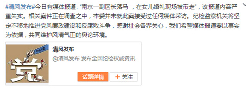 南京纪委:“副区长落马在女儿婚礼现场被带走”报道失实