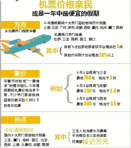 统计数据显示,与春节时航班“一票难求”的情况相比,今年清明期间机票价格总体不贵。携程机票专家表示,清明机票价格“亲民”,主要和中国人有在清明扫墓祭祖的传统,分流了机票需求有关,再加上今年春节较晚,市民短时内不太会再次回乡探亲。另外,各航空公司也在节日期间增加了运力,所以机票价格并没有明显上涨。“从目前预订情况来看,很多游客可能都把出游计划延后到了五一或端午,尤其今年端午在6月20日,恰逢高考结束,学校也已放假,很多市民可能会举家出游,届时机票价格预计会出现较大涨幅。”