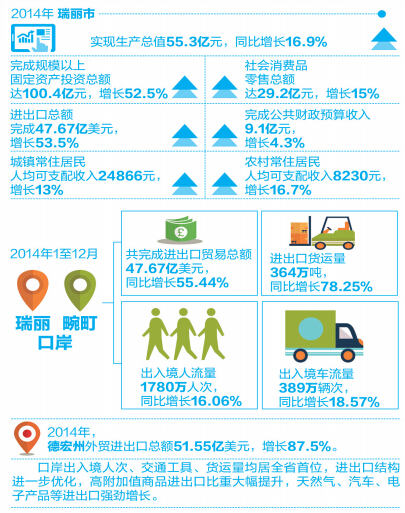 回首过去的一年,瑞丽作为试验区建设的“核心区”,经济社会发展迅猛。2014年全市实现生产总值55.3亿元,同比增长16.9%;完成规模以上固定资产投资总额突破百亿元大关,达100.4亿元,增长52.5%;社会消费品零售总额29.2亿元,增长15%;进出口总额完成47.67亿美元,增长53.5%;完成公共财政预算收入9.1亿元,增长4.3%;城镇常住居民人均可支配收入24866元,增长13%;农村常住居民人均可支配收入8230元,增长16.7%。