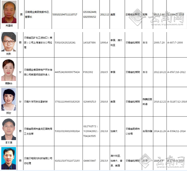 云南被红色通缉的6人中,最早出逃的是原云南省五矿化工进出口(集团)公司上海浦东分公司经理姚耿,为1998年4月,可能逃往泰国、澳大利亚;最晚的为原云南云电同方科技有限公司总经理张大伟,在2013年9月,可能逃往澳大利亚、加拿大、香港、美国。