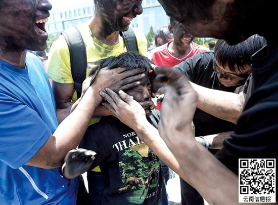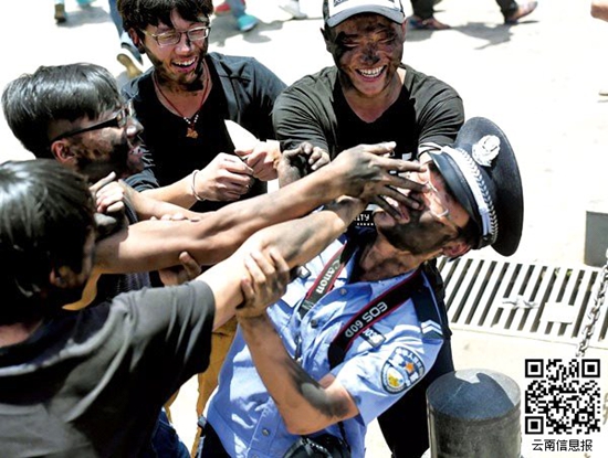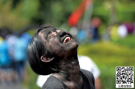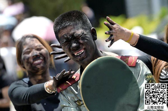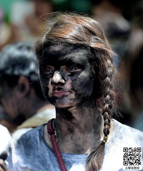 墨江哈尼族,素有“拜火”的传统,当地人将黑灰视为“火的结晶”,是吉祥的象征。在喜庆的场合,当地人常用“摸黑脸”来表达祝福。这次参加双胞胎节的上万名中外游客,在“摸黑脸”狂欢活动中,几乎没能幸免。