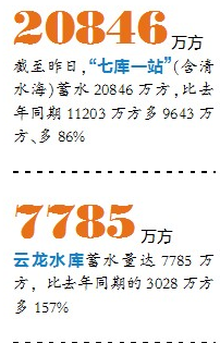 “七库一站”(含清水海)蓄水20846万方,比去年同期11203万方多9643万方、多86%。与4月21日的21597万方相比,减少了751万方。进入汛期后,随着各大库区的有效降雨增多,各大水库的蓄水量也将逐步攀升。