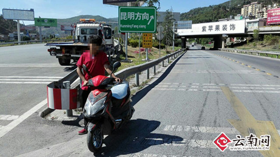 为了保证安全,民警用将小伙和他的电动车一同安全送下了高速公路。(云南网 通讯员张鹏翔 詹执圭)
