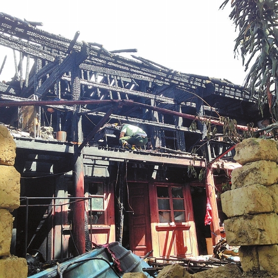 昨天上午9时许,记者在事发现场看到,发生火灾的民房是一幢两层的木质结构房屋,屋顶瓦片全部掉落,一楼靠北的两个房间被熏黑,房屋其余部分全被大火烧焦。