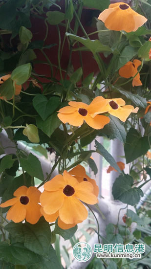 此外,金殿公园内的黑眼苏珊、龙翅海棠和玻利维亚海棠共展出约一千盆。黑眼苏珊因其黑色花心如一只媚眼而得名,属于藤本植物,花期2至3个月。在温室里,游客可以看到黑眼苏珊以不同的模样呈现在众人面前,有的黄色,有的浅黄色,有的花瓣中心有颗黑点,有的则没有,同一个花盆里的黑眼苏珊也可能呈现几种不同的状态。据介绍,这有可能是因为光照条件等因素的影响,也可能是移植过程中产生了变异。黑眼苏珊花瓣呈平瓣碟型,可垂吊养殖,亦能攀高3米,以其独特的“媚眼”吸引着观花者的目光。