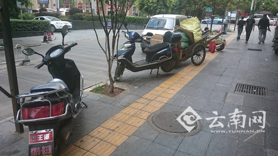 7月22日上午,云南网记者来到金鹰B座附近进行实地探访。该地段人员流动量大,非机动车停靠很多。记者观察一圈下来,发现有专人收费看管的车子停靠较为整齐规范,而商铺门口的电动车、自行车停放都很随意,部分还占用了盲道,昆明走廊上这一现象尤为普遍。