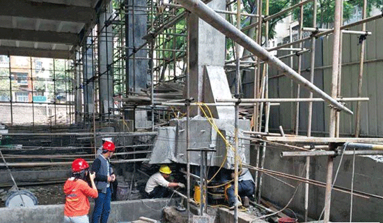 工人们正在给老旧的柱子“做手术”。记者杨映波/摄