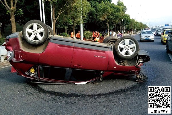昆明一辆越野车失控 四脚朝天翻在广福路