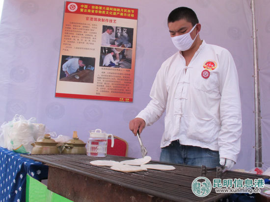 来自楚雄的苴却宝砚,来自呈贡的剪纸,来自丽江的铜器,来自云南省12个地州,33个非遗传承人都在这里设立了铺面,在这里,不但买到你心仪的产品,还可能欣赏到全省非遗传承人技艺展示,如果你有心,拜师学艺也是可以的。弥勒市文化馆长陈宝舜说,将全省的非遗技艺集中展示,在整个云南省从来没有过,通过这次活动,就是让游客了解云南省的非遗文化,让更过的人参与非遗的保护和传承中。(都市时报 记者王宗林)