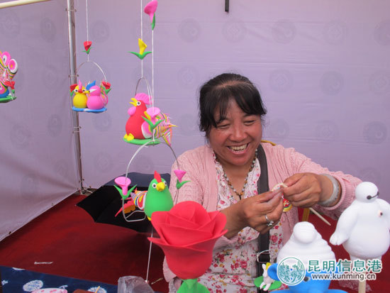 来自腾冲的非遗项目“皮影”制作最受游客的喜爱,买一个已经制作好的皮影,可以装裱成木框放在家里做装饰,非遗传承人也现场教授游客怎么玩皮影。来自曲靖“面塑”大师用橡皮泥,几分钟就制作好一个孔雀。传承人胡女士说,他丈夫的千人面塑《时代的脚步》获得过国家大奖。