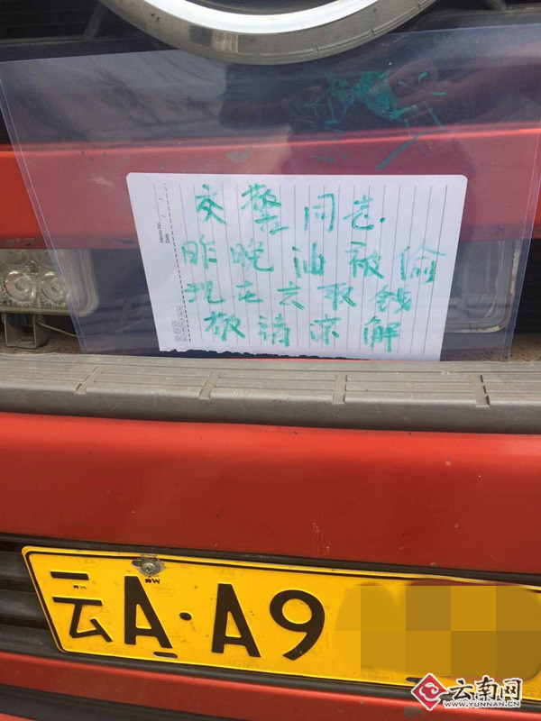 驾驶人胡师傅告诉民警,他头天晚上将车停在楚雄辖区的一个服务区休息,没有想到,油箱里的油被偷了,他也向当地公安部门报了警。当他驾车行驶到大理收费站后,由于身上没有带钱,车辆出不了收费站,于是他决定将车停在路边,进城去取钱。期间,他又怕交警遇到自己违法停车遭到处罚,就用张贴纸条这么一个方法请交警谅解自己的违法行为。