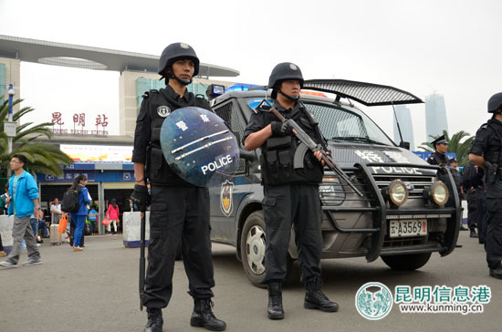 演练共分为二个阶段进行。第一阶段,全市启动应急处突一级防控响应。上午8时,昆明市应急处突指挥部下达“全市启动应急处突一级响应”命令,全市各相关单位和部门按照各自职能和预案要求立即启动应急处突一级防控响应机制,全市应急处突专业队伍根据各自职责,迅速集结备勤待命,随时做好参加应急处置的准备;全市“武装机动处突单元”立即开展动态化的武装巡逻和驻点守望,随时做好投入应急处置的实战准备;全市公安、武警、群防群治等巡逻防控力量立即启动重大案事件快速查缉响应机制,对车站、广场、大型商场等重点目标、重点部位、人员密集场所开展巡逻防控,在环昆明市主城区、各郊县(区)间、各远郊县与周边地州(市)主要出入通道各卡点设立“三道防线”开展设卡查缉工作;全市各县区党委、政府、开发(度假)园区、基层组织、综治成员单位、民兵预备役等单位也根据自身职责和预案要求,立即投入应急处突各项工作。形成了社会力量与公安、武警等专门力量相互补充,全城设防、高度戒备的强大震慑态势。