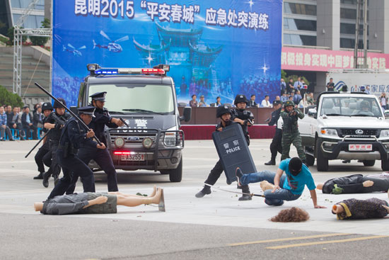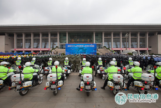 昆明信息港讯 记者王莹 8月31日上午,昆明市2015年“平安春城”应急处突演练在呈贡新区市级行政中心昆明会堂广场举行,全市同时启动应急处突一级防控响应机制。