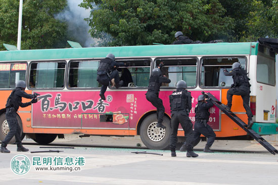 当天的重大突发案(事)件现场处置演练,以实战化为要求,突出扁平化指挥,强化快速反应和果断处置。当天的演练共分三个科目进行。科目一,驾车冲撞、刀斧砍杀现场处置。模拟警情设置以一伙暴徒驾车冲进某农贸市场,对群众进行冲撞碾压,并持刀砍杀群众为背景展开。根据模拟警情,昆明警方立即启动重大案(事)件快速反应机制,并根据警情的发生、发展和最新情况变化,通过市公安局110指挥中心,迅速调集和联动特警、武警、刑侦、医疗急救等应急处突力量前往处置。科目二,劫持人质现场处置演练。根据警情设置,一伙歹徒劫持了一辆公交车并以车上乘客为人质,与警方对峙。公安机关快速反应,调集指挥多部门、多警种合成作战,进行果断处置,抓捕歹徒,解救人质,并对现场可疑物品进行搜排清理。科目三,设卡拦截嫌疑车辆及暴徒现场处置演练。根据警情设置,公安机关对嫌疑车辆及暴徒实施堵截。市公安局110指挥中心接到报警后,迅速调集特警、武警、治安、刑侦、警航、消防等警力进行设卡拦截和追缉抓捕,联动调集医疗救援等力量随同作战,同时强化部署街面巡逻防控力量参与现场处置和出城交通要道卡点查缉围堵工作,最终通过多警种密切配合、合成作战,成功拦截车辆,制服暴徒,并排除车内疑似爆炸物。