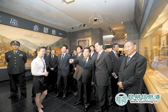 昨日,云南省纪念中国人民抗日战争暨世界反法西斯战争胜利70周年大会在腾冲县隆重举行。图为纪念大会结束后,李纪恒、陈豪等领导参观抗战研究成果展。云南日报记者雷桐苏/摄