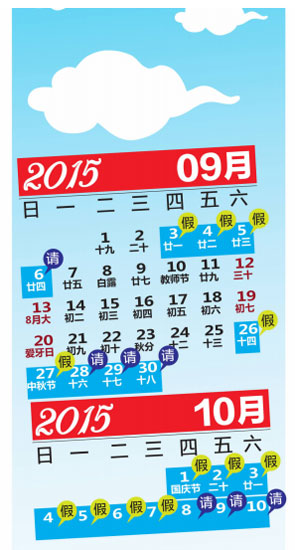 专家表示,因2015年中秋节和国庆节相邻近,如果中秋节在9月28日补假,国庆节后10月10日、11日(周六、日)就都需上班,为避免大家连上9天班,中秋节的补假放在了国庆节一起安排,国庆节后仅10月10日(周六)上班,公民休假总天数并未减少。