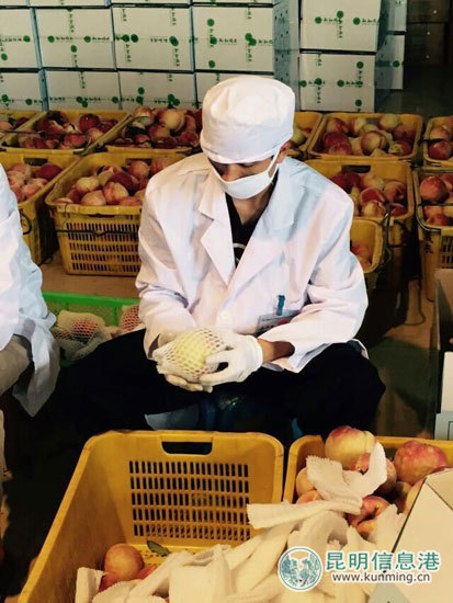 专业的工人对桃子进行分拣包装