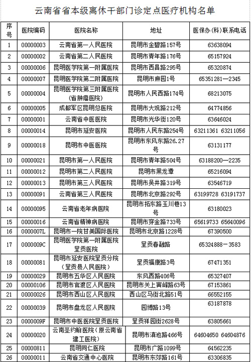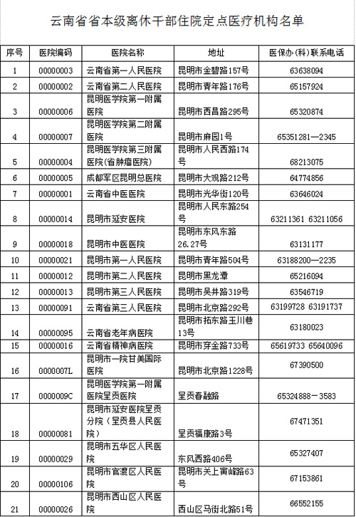 昆明信息港讯 记者王莹 近日,云南省人社厅下发《关于做好省本级离休干部持社会保障卡就医实时结算服务工作的通知》,自2015年10月1日起,离休干部到省本级离休干部定点医疗机构就医,需要持社会保障卡、《云南省省本级离休干部医疗保障证》(或《云南省干部医疗照顾证》、《云南省干部医疗特诊证》)、《云南省省本级离休干部专用病历本》。离休干部可持卡到昆明地区68家门诊定点医疗机构和26家住院定点医疗机构就医(名单附后)。