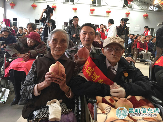 昆明信息港讯 记者王黎媛 9月19日,民盟云南省委、云南省青联、云南知行合一公益团队在昆明知青老年公寓举行“老兵不朽——慰问在滇抗战老兵公益活动”,大家为抗战英雄和老人们表演了丰富多彩的文艺节目,新知集团出品的李勇雪桃现场敬献抗战英雄,获得一致好评。