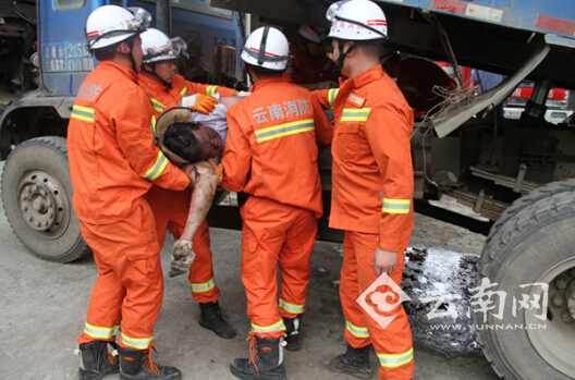 13时17分,救援官兵在吊车的协助下将被压在车箱下被困人员成功救出。并移交给现场医护人员救治。(云南网 记者杨之辉 通讯员张天龙)