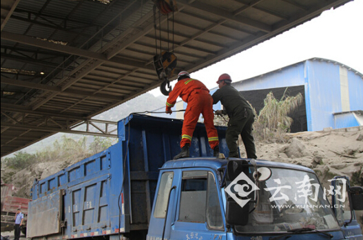 13时10分,在将车厢升起近20公分左右后,指挥员和水泥厂的负责人协调一辆吊车把车厢吊起。