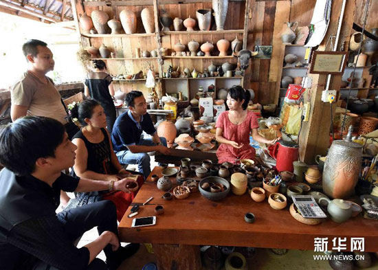 流传千年的手工技艺——云南西双版纳傣族慢轮制陶技艺是国家级非物质文化遗产。在“云南省陶瓷工艺大师”傣族慢轮制陶第四代传承人玉章凤的景洪博宫沙湾手工作坊里,由傣陶制成的茶罐、灯罩、锅碗琳琅满目,涵盖了从生活用品到现代装饰品的近百个品种,产品远销国内外。(新华网图片 杨宗友 摄)