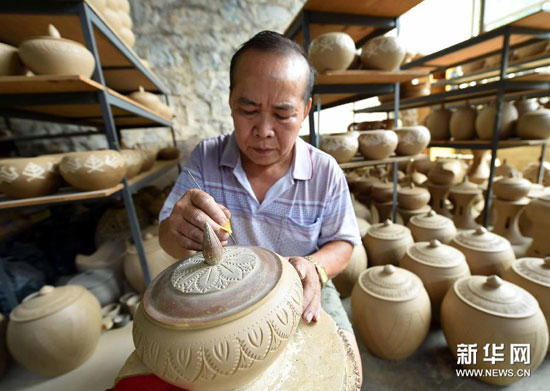 9月21日,在景洪博宫沙湾手工作坊里,傣族慢轮制陶第三代传承人岩罕滇在雕刻傣陶。