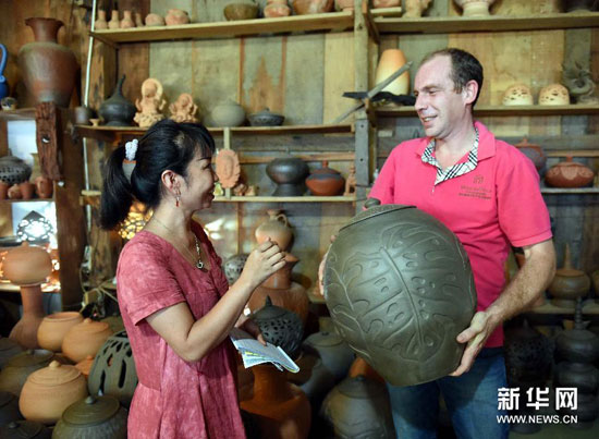 9月21日,玉章凤(右)在向顾客介绍傣陶工艺品。