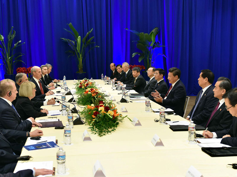 图为:2015年9月22日,国家主席习近平在西雅图集体会见美国华盛顿州州长英斯利、