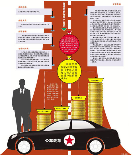 昆明信息港综合整理 今年12月底前,云南省级党政机关要基本完成公务用车改革。昨日上午,云南召开公务用车制度改革媒体政策解读会,透露云南公务用车制度改革总体方案及配套文件于8月11日获中央批复,全省公务用车改革已进入全面实施阶段。本轮车改,以取消一般公务用车,普通公务出行实行社会化提供并适度补贴交通费用为原则,仅可留用机要通信、应急等五类定向化保障车辆。其中省级机关公务用车削减幅度最大,超过70%。改革后,全省整体和省本级公务用车总支出将均比改革前降低7%以上。