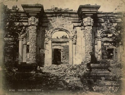 照片显示的是大报恩延寿寺全景,寺庙前两侧有两个大石狮子,石狮子之间一片瓦砾,大报恩延寿寺天王殿已经不见踪影,天王塑像只剩下下半身,衣衫精美。天王塑像旁有两座经幢,五六层高。照片右侧中部有转轮藏和万寿山昆明湖石碑。照片中还有通往大报恩延寿寺最高建筑佛香阁的平台扶手。