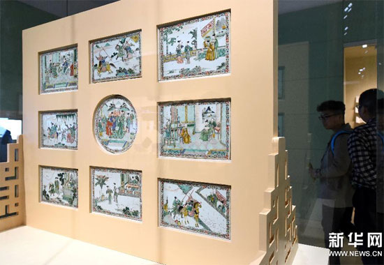 10月29日,南京博物院收藏的一组清代康熙年间的景德镇民窑五彩《西厢记》瓷插牌在展厅展出 孙参/摄