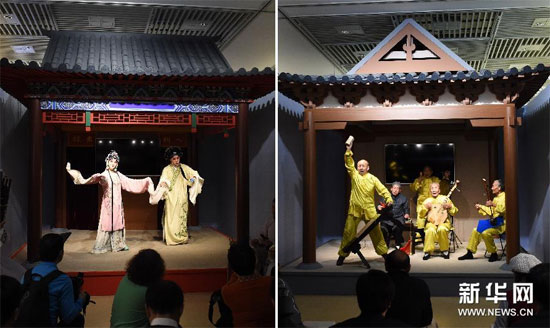 10月29日,来自陕西和江苏的演员在展厅分别表演江苏昆曲(左)和陕西老腔 孙参/摄