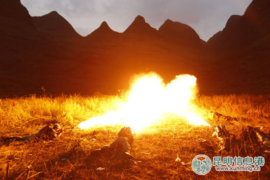 “喷火枪准备!”某扫雷队队长龙泉命令一出,3支喷火枪从3个纵火点同时喷火,霎时,雷场里的杂草、荆棘变成了一片火海,地表裸露了出来。察看“纵火毁雷”的效果后,龙队长指挥一辆扫雷车缓缓驶进雷场,随着齿轮的高速运转,泥土被高高扬起,一颗颗锈迹斑斑的地雷向挖地瓜一样,被刨出了地面。