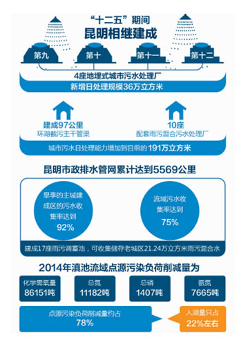 “十二五”期间,昆明相继建成第九、十、十一、十二4座地埋式城市污水处理厂,新增日处理规模36万立方米,使城市污水处理厂达到12座,出水水质均达到一级A标准。 同时,建成97公里环湖截污主干管渠及10座配套雨污混合污水处理厂,城市污水日处理能力由“十五”末的55.5万立方米,增加到目前的191万立方米。