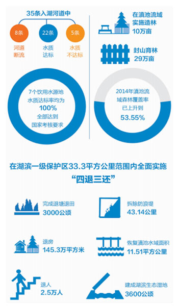 近年来,昆明在滇池流域实施造林10万亩、封山育林29万亩,2014年滇池流域森林覆盖率已上升到53.55%;在湖滨一级保护区33.3平方公里范围内全面实施“四退三还”,完成退塘退田3000公顷、退房145.3万平方米、退人2.5万人、拆除防浪堤43.14公里,恢复滇池水域面积11.51平方公里,建成湖滨生态湿地3600公顷。历史上首次出现 “湖进人退”,相继建成王官、斗南、东大河等湿地,湖滨带生态功能和生物多样性逐步恢复。