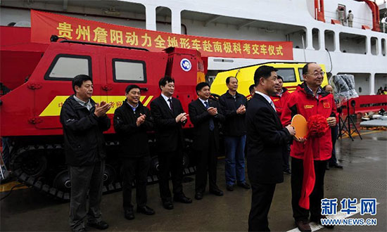 新华网上海11月4日电(记者张建松)我国极地考察装备国产化迈出重要一步。由中国极地研究中心和贵州詹阳动力重工有限公司共同研发的我国首款极地全地形车,4日在中国极地考察国内基地码头举行交车仪式,即将随“雪龙”号出征南极,加盟中国第32次南极科学考察。