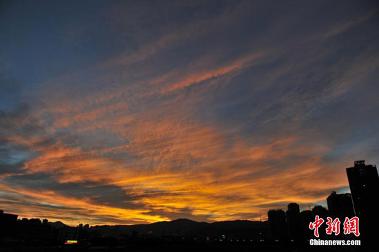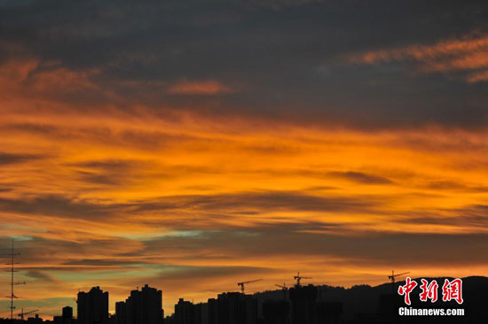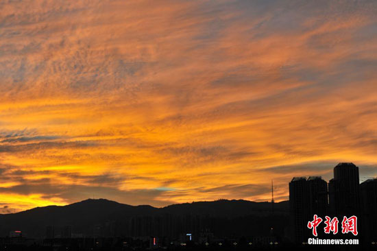 11月10日,昆明黄昏时分突现火烧云美景。虽然已过冬至,与全国大部分地区降温降雨相比,昆明天气依旧晴好,最高温度达到22℃。(中新社记者 任东 摄)