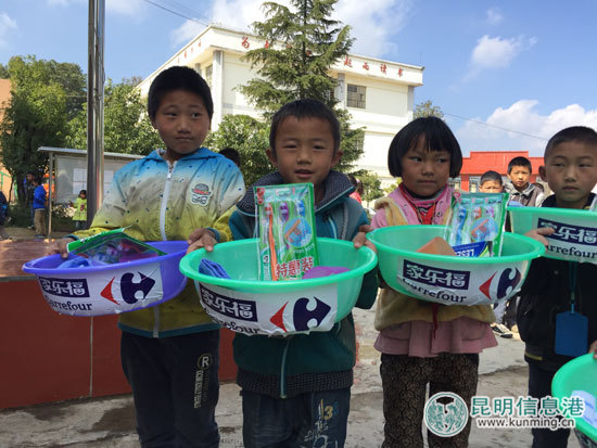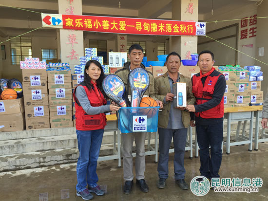 昆明信息港讯 记者张子源 11月12日,昆明家乐福“小善大爱——寻甸撒米洛金秋行”走进寻甸县回族彝族自治县河口镇撒米落寄宿制完小,为学校400多名师生带来一批价值2万余元的生活用品和文体用品。