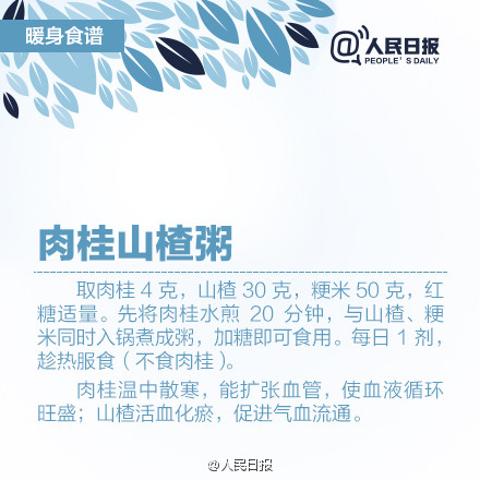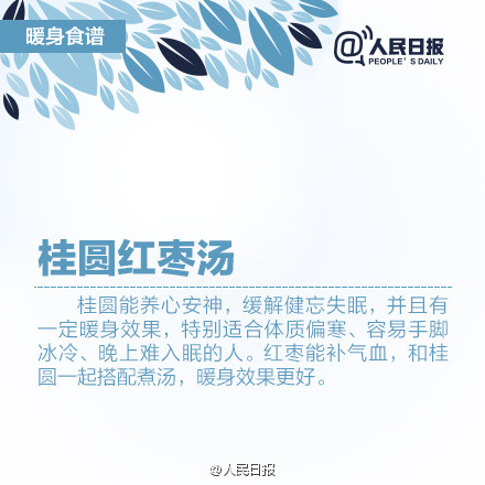 这种情况的人,平时要注意保暖,特别是腿、脚的保暖,如果下肢保暖做得好,全身都会觉得暖和。晚上睡觉前,一定记得泡脚,脚热了更容易入睡。饮食方面,应多吃一些性属温热的食品,如牛肉、羊肉、鸡肉,大蒜、辣椒、生姜、桂圆等,以提高机体耐寒力。