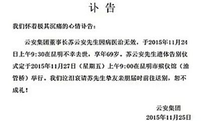 记者向大堂工作人员询问,工作人员让记者联系一名副总,得知苏云安的家属及公司领导都在昆明市殡仪馆油管桥服务站处理善后事宜。家属不愿意接受采访,云安集团除发布讣告外对此事未作回应。