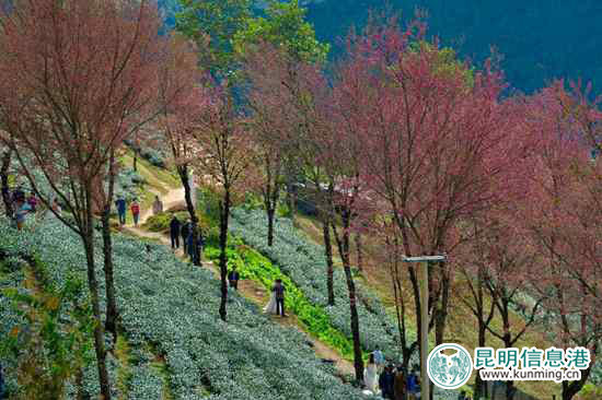 向景区深处走去,路边茶园里的冬樱花开得正好,数对新人都不约而同地选择在这里拍摄婚纱照,身着洁白婚纱的新娘在粉红樱花的映衬下显得更加娇艳动人。摄影师按下快门,新人们相互依偎,在樱花树下留住宗 人生最美好的瞬间。
