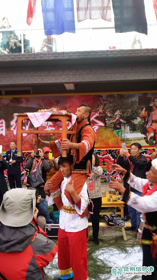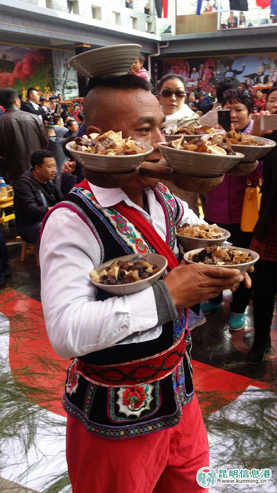 无量山樱花谷内表演的南涧跳菜绝活“口功送菜”。杨雁/摄