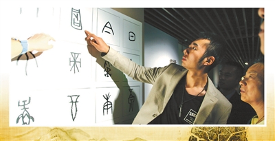 特别值得一提的是,本次展览特别注重互动性和体验性。在展厅内,有一片郁郁葱葱的绿色区域,这是专门为参观甲骨文记忆展的人准备的互动区域——甲骨姓属林。在这片甲骨姓属林中,每一片悬挂的绿叶上都有一个甲骨文的姓氏或者十二生肖属相,旁边的展板上设有甲骨文姓氏、属相和现代汉字的对照表。通过一片片姓氏、属相之叶让观众参与到找姓氏和属相的互动游戏中来,从而认识和自己信息相关的甲骨文。(如图:观众辨识甲骨文。张 鹏摄)